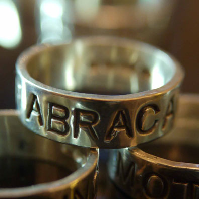 6mm wide sterling silver ring handstamped with the word ABRACADABRA.